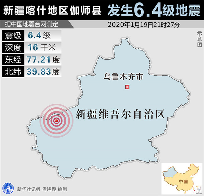 據(jù)中國地震臺網(wǎng)正式測定,19日21時(shí)27分在新疆喀什地區(qū)伽師縣發(fā)生6.4級地震,震源深度16千米,震中位于北緯39.83度,東經(jīng)77.21度。