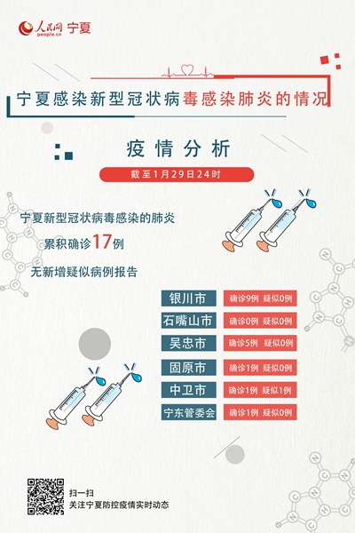 截至1月29日24時(shí),全區(qū)累計(jì)報(bào)告新型冠狀病毒感染的肺炎確診病例17例,其中銀川市9例(興慶區(qū)3例、金鳳區(qū)2例、西夏區(qū)2例、永寧縣2例)、吳忠市5例(利通區(qū)4例、紅寺堡區(qū)1例)、固原市1例(原州區(qū))、中衛(wèi)市1例(沙坡頭區(qū))、寧東管委會(huì)1例(寧東鎮(zhèn));累計(jì)疑似病例1例(中衛(wèi)市)。