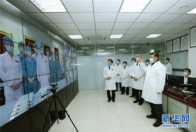 習近平十分牽掛湖北和武漢的疫情。在地壇醫(yī)院遠程診療中心,習近平通過視頻連線武漢市收治新冠肺炎患者的金銀潭醫(yī)院、協(xié)和醫(yī)院、火神山醫(yī)院,向疫情防控一線的醫(yī)務(wù)工作者、干部職工和人民解放軍指戰(zhàn)員了解情況、聽取意見和建議。他強調(diào),全國廣大醫(yī)務(wù)工作者不忘初心、牢記使命,響應(yīng)黨的號召,義無反顧沖上疫情防控第一線,同時間賽跑,與病魔較量,頑強拼搏、日夜奮戰(zhàn),展現(xiàn)了對黨、對人民高度負責的精神面貌。他指出,現(xiàn)在疫情防控正處于膠著對壘狀態(tài),廣大醫(yī)務(wù)工作者一定要堅持下去,發(fā)揚特別能吃苦、特別能戰(zhàn)斗的精神,發(fā)揮火線上的中流砥柱作用,始終把人民群眾生命安全和身體健康放在首位,全力以赴救治患者,打好武漢保衛(wèi)戰(zhàn)、湖北保衛(wèi)戰(zhàn)。