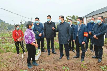 春回大地,正是春耕好時節(jié)。黎明村村民搶抓農(nóng)時,有的在翻耕土地,有的正給田間作物澆水施肥,有的在播種早春玉米,一片忙碌景象。彭清華走進村口的花椒基地,與套種茄子秧苗的村民親切交談,詢問栽種面積、土壤墑情、生長周期、市場銷路等情況。他說,一年之計在于春,切實抓好春耕生產(chǎn)對于實現(xiàn)全年豐產(chǎn)豐收意義重大。農(nóng)時不等人,要在嚴格落實防控措施的同時,及時推進春季農(nóng)業(yè)生產(chǎn)和生豬恢復(fù)生產(chǎn),因地制宜調(diào)整種養(yǎng)業(yè)結(jié)構(gòu),確保穩(wěn)產(chǎn)保供和農(nóng)民持續(xù)增收。有關(guān)部門要繼續(xù)做好服務(wù)保障,加強技術(shù)指導(dǎo),強化農(nóng)資儲備、調(diào)劑和配送,搞好產(chǎn)銷銜接,讓生產(chǎn)資料進得來、農(nóng)產(chǎn)品賣得出。對隔離觀察群眾要做好生產(chǎn)扶持工作,幫助他們克服困難、不誤農(nóng)時。