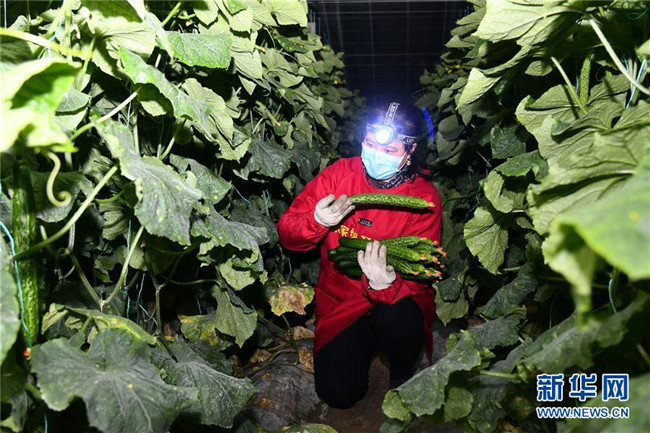 2月2日凌晨,在山東省壽光市綠圣果蔬專業(yè)合作社,菜農(nóng)桑雪梅帶著頭燈在采摘黃瓜以供應(yīng)新冠肺炎疫情嚴(yán)重的武漢地區(qū)。新華社記者 郭緒雷 攝