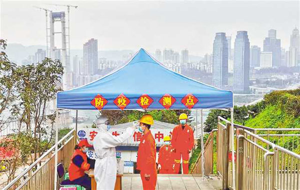 二月二十九日,在中鐵隧道三處重慶軌道交通十號(hào)線二期七星崗項(xiàng)目部,工人們正拉開間距排隊(duì)測量體溫后進(jìn)入工地。通訊員 周勇 攝