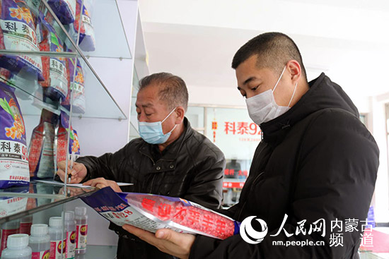 3月14日一大早,鄂爾多斯市農(nóng)牧業(yè)綜合執(zhí)法局工作人員高士成就和同事們來到了伊金霍洛旗生存農(nóng)資綜合服務(wù)中心,該旗有近三分之一的農(nóng)資在這里銷售。在測(cè)完體溫做好登記后,執(zhí)法人員一行走進(jìn)服務(wù)中心銷售店內(nèi)。