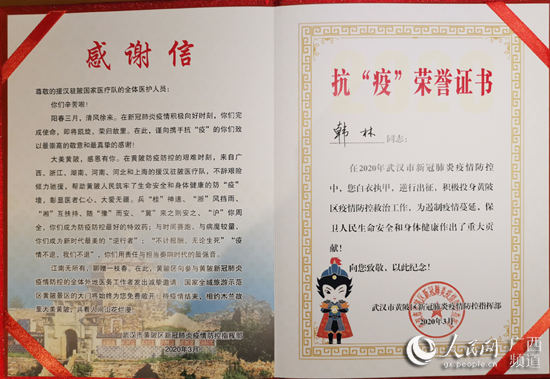 韓林收到的抗擊疫情榮譽證書。韓林供圖