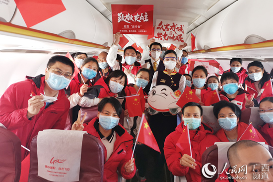 廣西援鄂醫(yī)療隊隊員在飛機上合影。韓林供圖