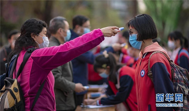 3月23日,昆明市第一中學(xué)工作人員為進(jìn)入校園的學(xué)生測量體溫。新華社記者 江文耀 攝
