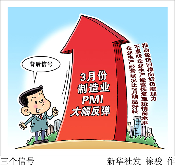 國(guó)家統(tǒng)計(jì)局服務(wù)業(yè)調(diào)查中心、中國(guó)物流與采購(gòu)聯(lián)合會(huì)31日發(fā)布數(shù)據(jù),3月份,中國(guó)制造業(yè)采購(gòu)經(jīng)理指數(shù)(PMI)為52%,比上月回升16.3個(gè)百分點(diǎn)。制造業(yè)PMI為何大幅反彈?回到榮枯線上方是否意味著經(jīng)濟(jì)企穩(wěn)?記者采訪了相關(guān)部門和專家。
