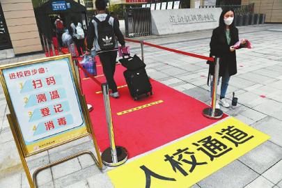 成都教科院附中高一年級(jí)學(xué)生返校時(shí),學(xué)生統(tǒng)一在指示標(biāo)牌的指引下,依次經(jīng)過(guò)“1米靜候區(qū)”“紅外體溫監(jiān)測(cè)儀測(cè)溫區(qū)”,同時(shí)檢查學(xué)生的健康碼、對(duì)行李等物品進(jìn)行消毒,學(xué)校的“教師黨員服務(wù)隊(duì)”為住宿學(xué)生搬運(yùn)行李等隨身物品。每班班主任收取《健康申報(bào)卡》《14日體溫監(jiān)測(cè)表》《家長(zhǎng)承諾書(shū)》以及《學(xué)生承諾書(shū)》。飯點(diǎn)時(shí)間,學(xué)生在班主任帶領(lǐng)下沿指定行徑路線錯(cuò)峰到食堂就餐,食堂設(shè)置了“單循環(huán)”的用餐路線,避免學(xué)生交叉聚集。為迎接復(fù)課,每位班主任都準(zhǔn)備了額溫槍、學(xué)生體溫監(jiān)測(cè)臺(tái)賬、因病缺課不能到校學(xué)生臺(tái)賬、免洗手消毒凝膠、醫(yī)用消毒酒精等“防疫五件套”。(四川日?qǐng)?bào)記者 李向雨 攝影報(bào)道)