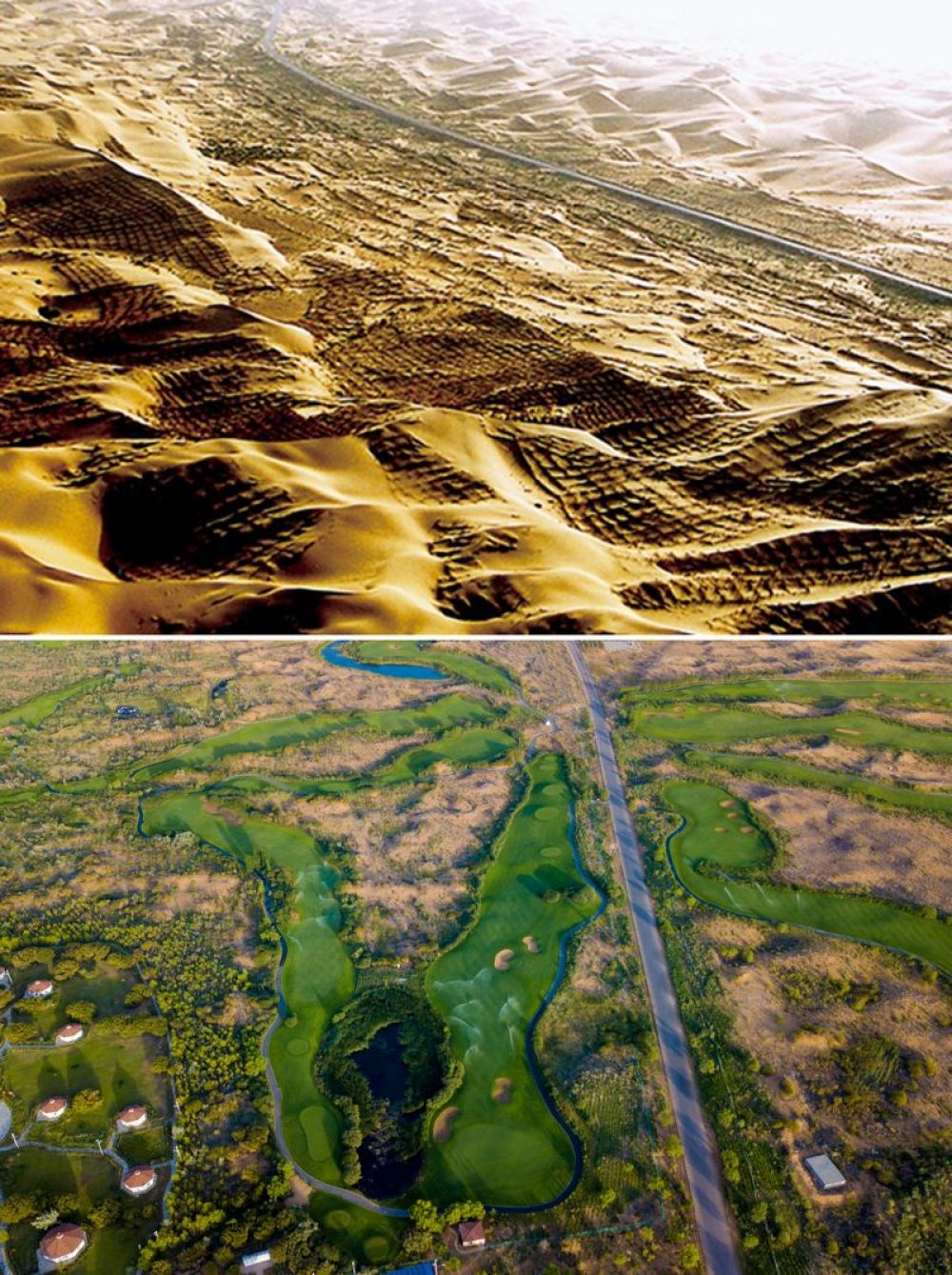 經(jīng)過30余年的艱苦治理,中國第七大沙漠——內(nèi)蒙古庫布其沙漠,從原是飛鳥難越的“死亡之海”,變?yōu)槿缃裆撤寰G谷交相輝映。