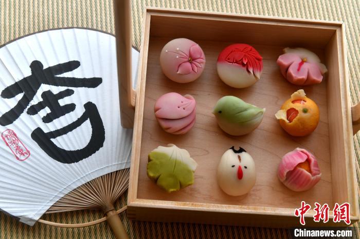據(jù)介紹,和果子,是一種日式佐茶點心,它的外皮由豆子、糖、糯米等食材制成,內(nèi)餡以五谷果蔬為原料。和果子的制作原料取自自然,外皮上鮮艷的色彩均由可食用的植物色粉調(diào)制而成。