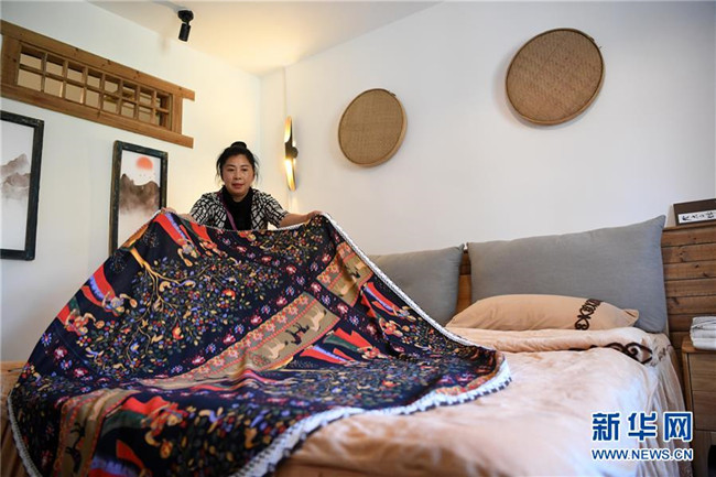 4月29日,在重慶忠縣“三峽橘鄉(xiāng)”田園綜合體內(nèi),工作人員在特色民宿內(nèi)整理臥具。新華社記者 唐奕 攝