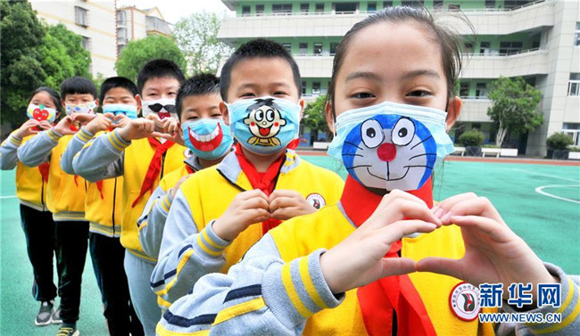 5月8日,安徽省安慶市迎江區(qū)華中路第二小學在操場上開展手繪“微笑口罩”創(chuàng)意活動,通過讓孩子們手繪各式笑臉并貼到口罩上的方式,引導學生培養(yǎng)健康樂觀的心態(tài)。 當日是世界微笑日。 新華社發(fā)(黃有安 攝)