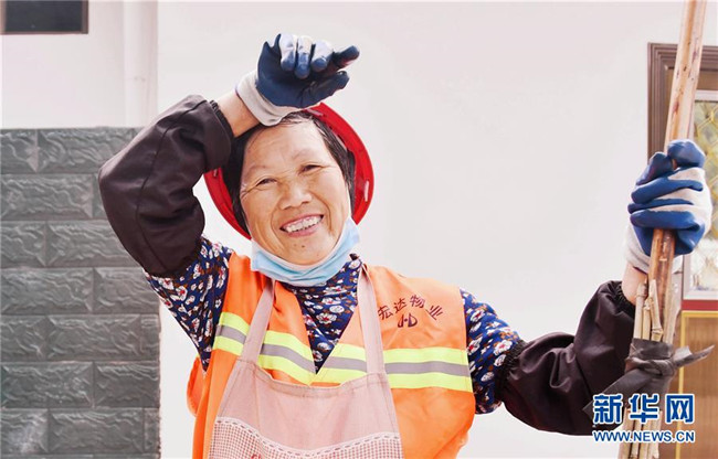 5月8日,湖南省江永縣瀟浦鎮(zhèn)永陽路,環(huán)衛(wèi)工人唐翠英面帶微笑在清掃間隙小憩。 當日是世界微笑日。 新華社發(fā)(田如瑞 攝)