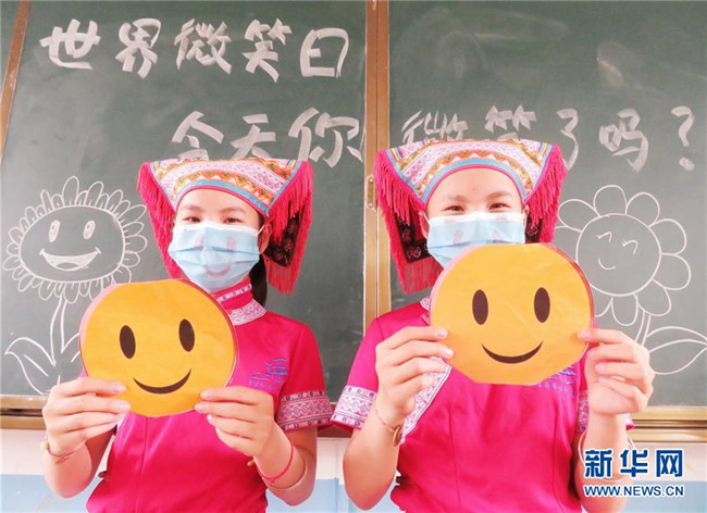5月8日,在湖南省江永縣蘭溪瑤族鄉(xiāng)學校六年級一班,一對雙胞胎姐妹在展示自制的笑臉卡。 當日是世界微笑日。 新華社發(fā)(田如瑞 攝)