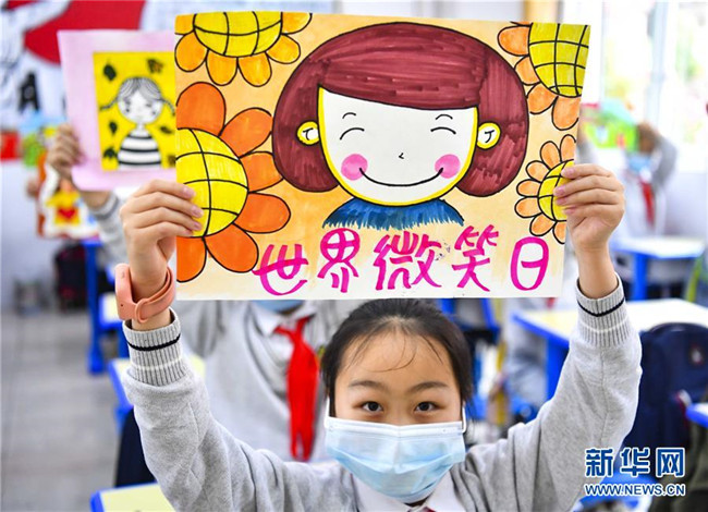 5月8日,在安徽省亳州市譙城區(qū)風華桐鄉(xiāng)路小學,一名學生展示自己繪畫的笑臉。 當日是世界微笑日。 新華社發(fā)(劉勤利 攝)