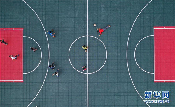 在廣西融水苗族自治縣桿洞鄉(xiāng)黨鳩小學(xué),學(xué)生們?cè)谛虑驁錾咸咔颍?月13日攝,無人機(jī)照片)。新華社記者黃孝邦攝