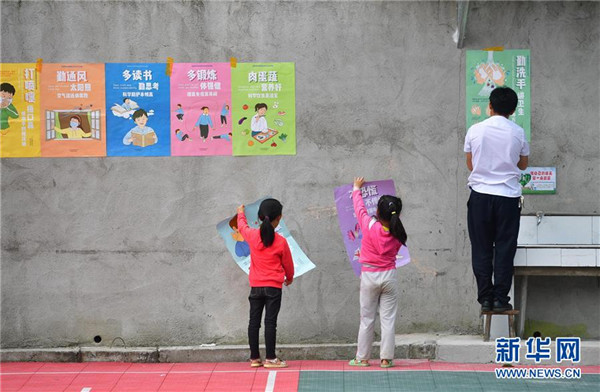 在廣西融水苗族自治縣桿洞鄉(xiāng)黨鳩小學(xué),師生們?cè)谛@里張貼海報(bào)(5月13日攝)。新華社記者黃孝邦攝