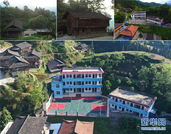 這張拼版照片的上圖左、中為黨鳩小學(xué)2006年之前一直使用的木質(zhì)教學(xué)樓(資料照片);上圖右為黨鳩小學(xué)自2006年至改造前的教學(xué)樓(新華社記者黃孝邦2019年7月5日攝,無人機(jī)照片);下圖為自2019年起至今升級(jí)改造后的黨鳩小學(xué)(新華社記者黃孝邦2020年4月15日攝,無人機(jī)照片)。