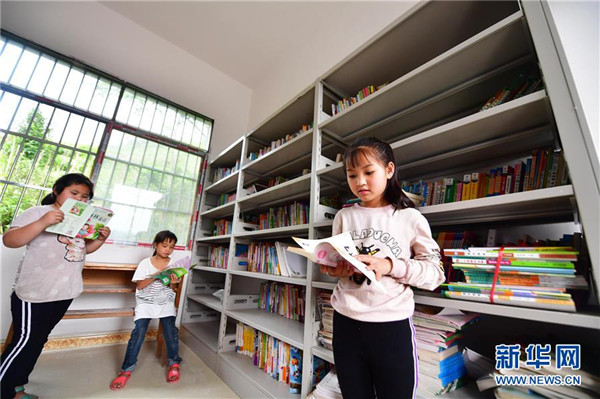 在廣西融水苗族自治縣桿洞鄉(xiāng)黨鳩小學(xué),學(xué)生們?cè)趫D書室里閱讀(5月13日攝)。新華社記者黃孝邦攝