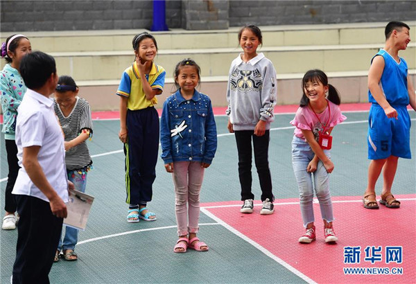 在廣西融水苗族自治縣桿洞鄉(xiāng)黨鳩小學(xué),師生們?cè)谶M(jìn)行戶外游戲(5月13日攝)。新華社記者黃孝邦攝