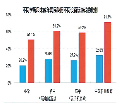 除了學習之外,網(wǎng)絡已經(jīng)成為未成年人娛樂和社交的重要工具?!秷蟾妗凤@示,聽音樂和玩游戲繼續(xù)是目前未成年網(wǎng)民的主要網(wǎng)上娛樂活動,分別為65.9%和61.0%。前者作為未成年人的娛樂方式為家長、學校等各方所接受,但是后者引起很多爭議。近年來,網(wǎng)絡游戲行業(yè)發(fā)展迅速,伴隨智能手機的普及,向未成年群體的滲透更加快速。調(diào)查顯示,61.0%的未成年網(wǎng)民會經(jīng)常在網(wǎng)上玩游戲,手機是未成年人上網(wǎng)玩游戲的主要設備。小學生網(wǎng)民玩手機游戲的比例超過一半;初中和高中生網(wǎng)民玩手游的比例分別為61.2%和59.2%;中職學生網(wǎng)民達到71.7%。短視頻是近幾年蓬勃興起的互聯(lián)網(wǎng)娛樂服務。2019年未成年網(wǎng)民在互聯(lián)網(wǎng)上經(jīng)常收看短視頻的比例達到46.2%,較2018年的40.5%提升5.7個百分點。