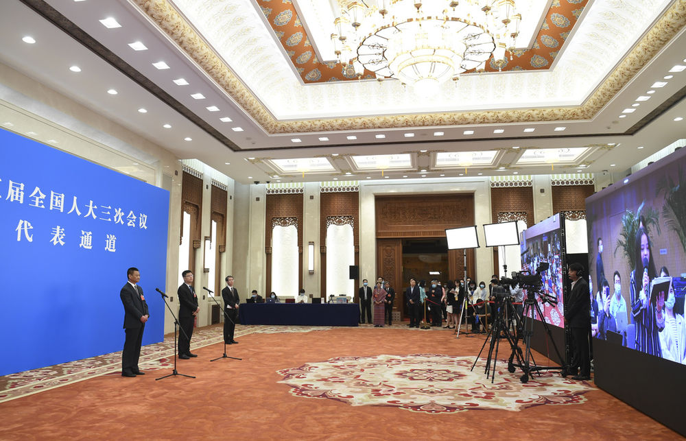 這是全國(guó)人大代表通過網(wǎng)絡(luò)視頻方式接受采訪。(新華社記者金良快 攝)