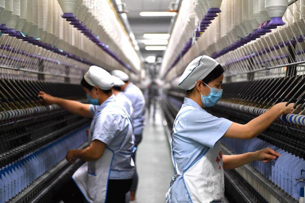 在抗擊新冠肺炎疫情過程中,陜西省咸陽紡織集團(tuán)有限公司一分廠紡織工人堅(jiān)守在復(fù)工復(fù)產(chǎn)一線,搶抓工時(shí)完成生產(chǎn)任務(wù)。(新華社記者張博文 攝)