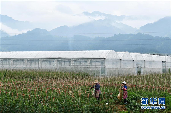 6月2日,農(nóng)民在貴州省榕江縣車江壩區(qū)采收西紅柿。 新華社記者 楊文斌 攝