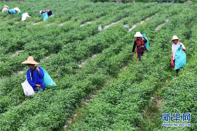6月2日,農(nóng)民在貴州省榕江縣車江壩區(qū)采收辣椒。新華社記者 楊文斌 攝