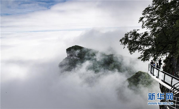 6月10日,游人在漢中市南鄭區(qū)龍頭山景區(qū)玻璃棧道上觀(guān)賞云海。雨后初霽,川陜交界的陜西省漢中市南鄭區(qū)龍頭山旅游景區(qū)云海涌動(dòng),風(fēng)光迷人。新華社記者陶明攝