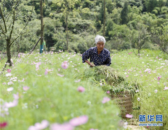 6月10日,在重慶市渝北區(qū)大盛鎮(zhèn)天險洞村,村民為觀賞花卉除草。新華社記者 黃偉 攝