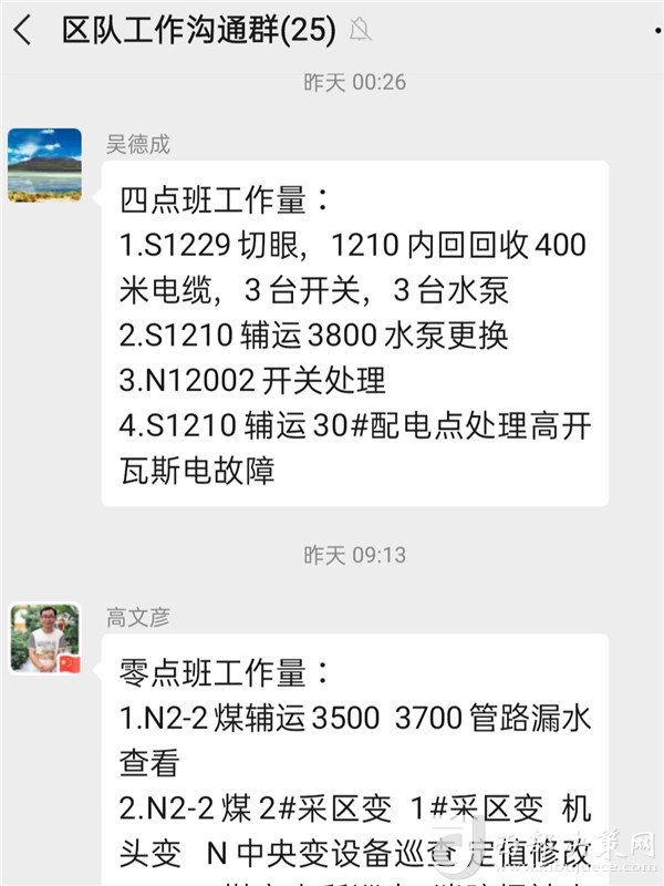 “南翼1210回風巷回收400米低壓電纜”“南翼1210輔運3800米處更換水泵一臺”......凌晨十二點半,剛下晚班的跟班副區(qū)長吳德成便用手機編輯信息,將當班任務(wù)完成情況匯報至區(qū)隊工作微信群。