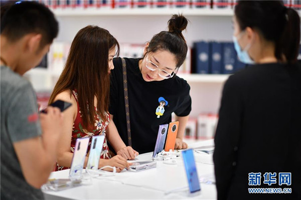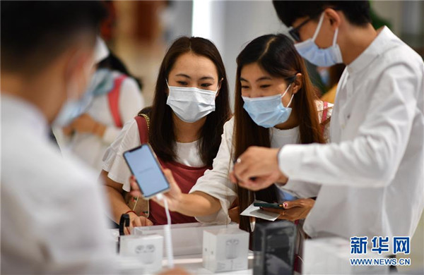 7月1日,顧客在??谌赵聫V場免稅店選購手機等電子消費產品。當日,海南開始實施調整后的離島免稅購物政策。海南離島旅客每年每人免稅購物額度提高至10萬元,電子消費產品等7類新增商品開售。新華社記者郭程攝