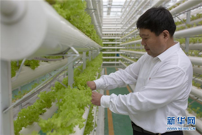 山東省蘭陵縣代村黨委書記王傳喜在查看無土栽培蔬菜長(zhǎng)勢(shì)(6月18日攝)。新華社記者王陽攝