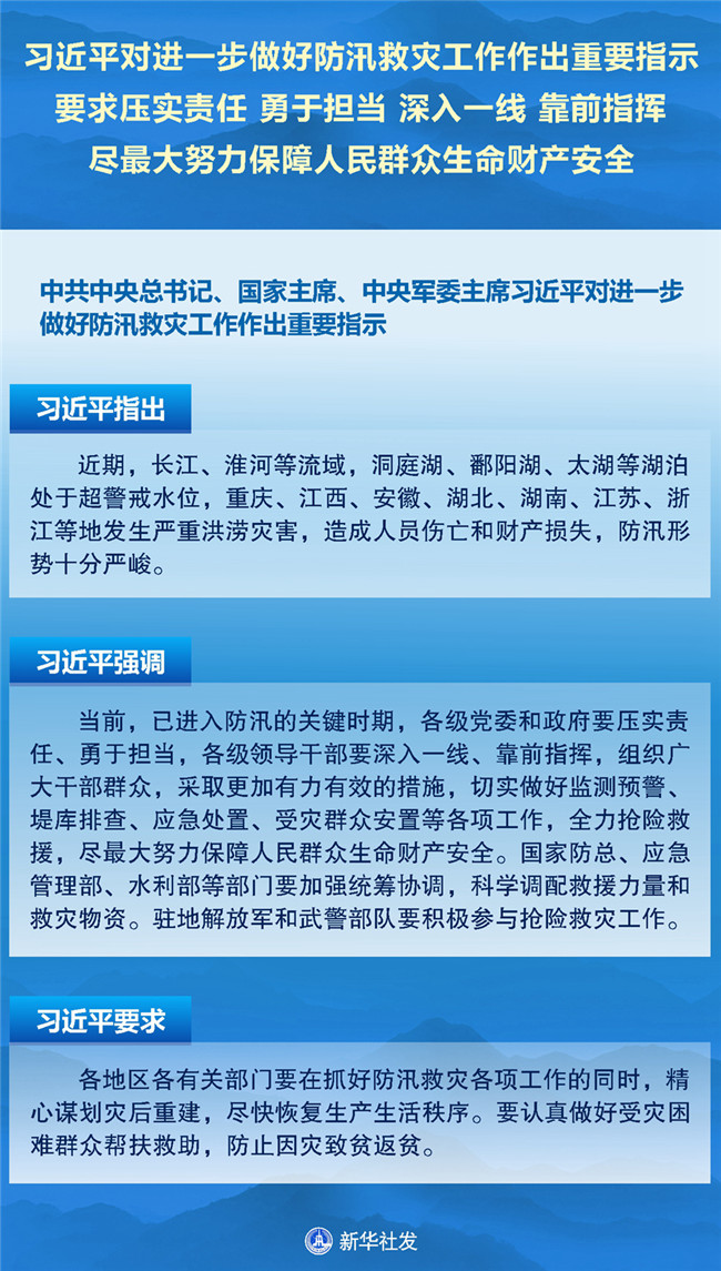 中共中央總書記、國家主席、中央軍委主席習(xí)近平對進一步做好防汛救災(zāi)工作作出重要指示。