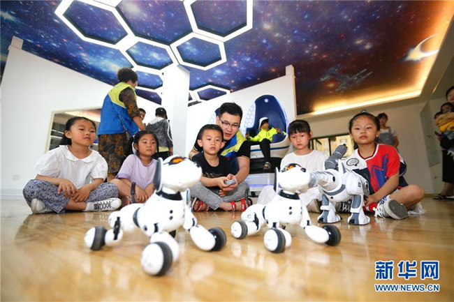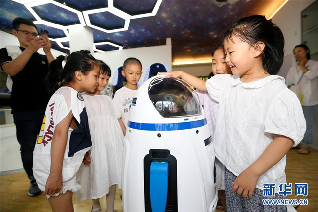 7月12日,小學(xué)生在山東省青島市即墨區(qū)環(huán)秀街道濱湖社區(qū)科普館與機(jī)器人互動(dòng)。新華社發(fā)(梁孝鵬 攝)