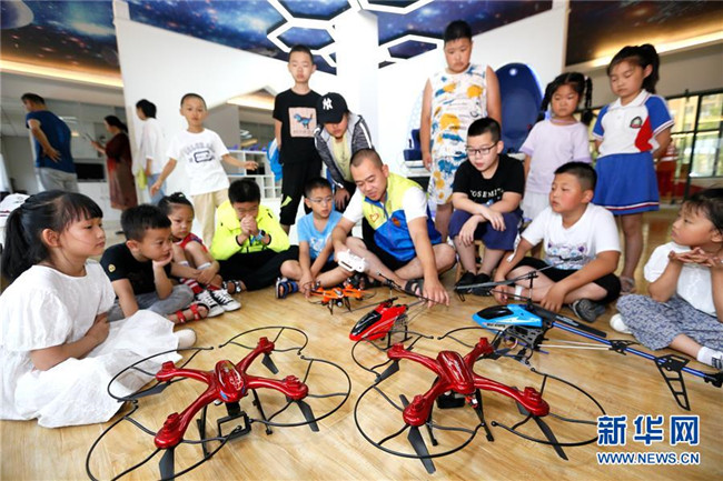 7月12日,山東省青島市即墨區(qū)環(huán)秀街道濱湖社區(qū)科普館工作人員在給小學(xué)生講解無人機(jī)飛行常識(shí)。新華社發(fā)(梁孝鵬 攝)