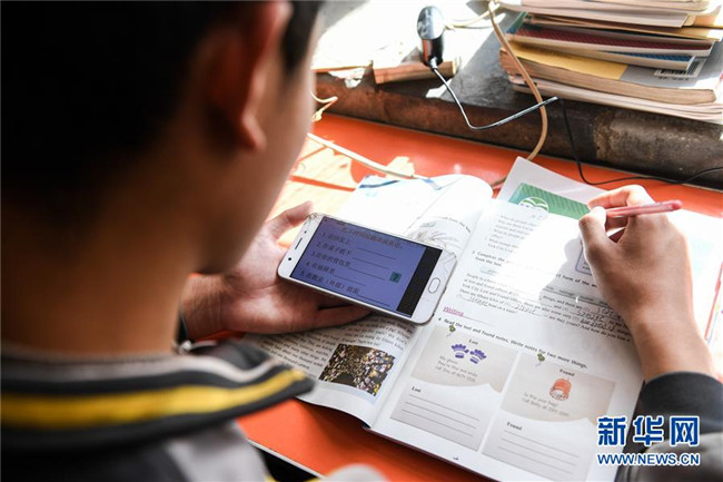 內蒙古準格爾旗龍口鎮(zhèn)紅樹梁村的初一學生劉進才在家中上網(wǎng)課(3月10日攝)。新華社記者 劉磊 攝