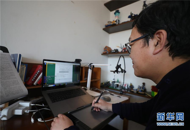 遼寧省沈陽市蘇家屯區(qū)青松中學杜波老師在家中通過網(wǎng)絡平臺給同學們上化學課(3月11日攝)。新華社記者 楊青 攝