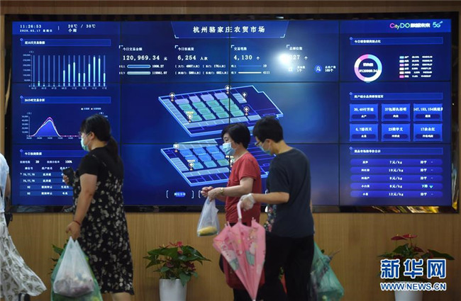 浙江省杭州市的5G農貿市場——駱家莊農貿市場的大屏幕上實時顯示交易、客流等相關情況(5月17日攝)。新華社記者 韓傳號 攝