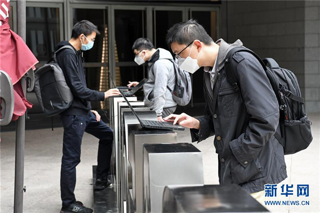 在深圳平安金融中心,企業(yè)員工在樓下使用筆記本電腦連接公司內網(wǎng)下載安裝遠程辦公軟件,以便實現(xiàn)居家“云辦公”(2月10日攝)。新華社記者 梁旭 攝