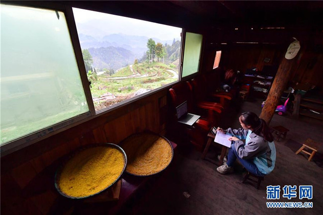 在廣西融水苗族自治縣桿洞鄉(xiāng)黨鳩村,就讀于廣西科技師范學院的梁孟香在家里上網(wǎng)課(4月9日攝)。新華社記者 黃孝邦 攝