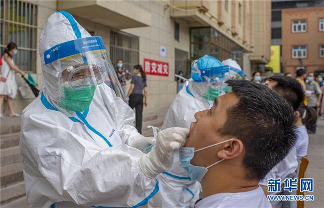 7月17日起,烏魯木齊市開始對(duì)全市居民進(jìn)行免費(fèi)核酸檢測,重點(diǎn)人群所在社區(qū)要實(shí)現(xiàn)100%檢測。家住天山區(qū)光北社區(qū)的63歲居民雷雙蘭說:“19日社區(qū)挨戶通知下樓排隊(duì)檢測,大家都戴著口罩,前后保持一米安全距離,一家人幾分鐘就檢測完了。”