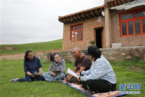 7月23日,在甘肅省甘南藏族自治州夏河縣??奇?zhèn)崗岔村,卓瑪吉(左二)和駐村幫扶工作隊隊員一起入戶了解村民巴桑一家的生產(chǎn)生活情況。崗岔村是甘肅省甘南藏族自治州夏河縣桑科鎮(zhèn)的一個牧業(yè)村,平均海拔3000米以上。2018年,在夏河縣文明辦工作的卓瑪吉開始擔任駐村幫扶工作隊隊長,每年都有200多天待在草原上。兩年來,卓瑪吉帶領(lǐng)大家開辦扶貧車間,發(fā)展特色產(chǎn)業(yè),聯(lián)系勞務輸出。為了讓村民更全面地了解精準扶貧政策,卓瑪吉登門宣講政策。為了提高村容村貌,卓瑪吉發(fā)動大家開展廁所革命和庭院環(huán)境評比,積極響應甘南藏族自治州“全域無垃圾”創(chuàng)建行動。她還從縣城請來醫(yī)生,為村民舉辦健康講座,在全村婦女中開展“兩癌篩查”。如今,崗岔村變成了干凈、整齊、富裕、美麗的生態(tài)文明村,提前實現(xiàn)了整村脫貧。談起心愿,卓瑪吉說:“要讓草原和草原上的人都變得更美。”新華社發(fā)(杜哲宇攝)