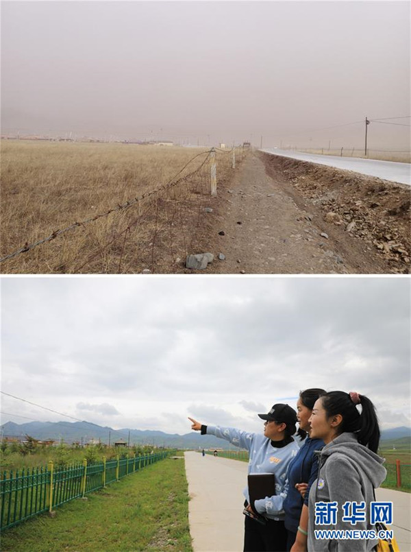 拼版照片:上圖為崗岔村村道綠化改造前的面貌(資料照片)。下圖為7月23日,卓瑪吉(右一)和駐村幫扶工作隊隊員站在綠化改造后的崗岔村村道上,謀劃下一步的工作。新華社發(fā)(杜哲宇攝)崗岔村是甘肅省甘南藏族自治州夏河縣??奇?zhèn)的一個牧業(yè)村,平均海拔3000米以上。2018年,在夏河縣文明辦工作的卓瑪吉開始擔任駐村幫扶工作隊隊長,每年都有200多天待在草原上。兩年來,卓瑪吉帶領(lǐng)大家開辦扶貧車間,發(fā)展特色產(chǎn)業(yè),聯(lián)系勞務輸出。為了讓村民更全面地了解精準扶貧政策,卓瑪吉登門宣講政策。為了提高村容村貌,卓瑪吉發(fā)動大家開展廁所革命和庭院環(huán)境評比,積極響應甘南藏族自治州“全域無垃圾”創(chuàng)建行動。她還從縣城請來醫(yī)生,為村民舉辦健康講座,在全村婦女中開展“兩癌篩查”。如今,崗岔村變成了干凈、整齊、富裕、美麗的生態(tài)文明村,提前實現(xiàn)了整村脫貧。談起心愿,卓瑪吉說:“要讓草原和草原上的人都變得更美。”新華社發(fā)