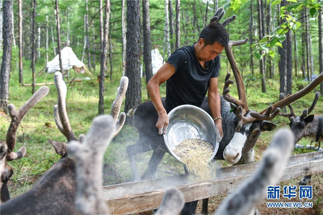 古木森在根河市烏力庫瑪林場內的馴鹿放養(yǎng)點喂馴鹿(7月13日攝)。 新華社記者 貝赫 攝