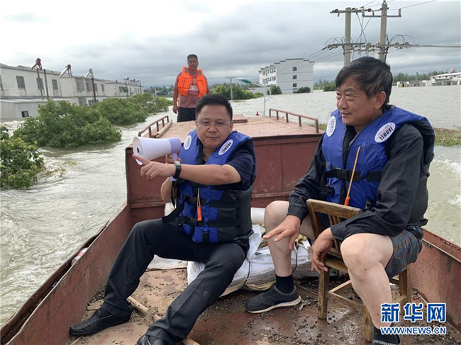 7月15日,安徽省宿松縣洲頭鄉(xiāng)黨委書記唐志華(左)在查看泗洲村受災情況。 新華社發(fā)