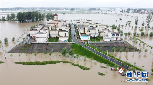 這是被洪水包圍的安徽省阜南縣曹集鎮(zhèn)西田坡莊臺,蓄洪區(qū)內(nèi)的所有莊臺上都有黨員干部值守(7月24日攝,無人機照片)。 新華社記者 張端 攝