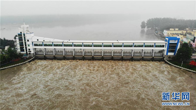 7月20日,淮河王家壩閘開閘泄洪(無人機照片)。 新華社記者 黃博涵 攝