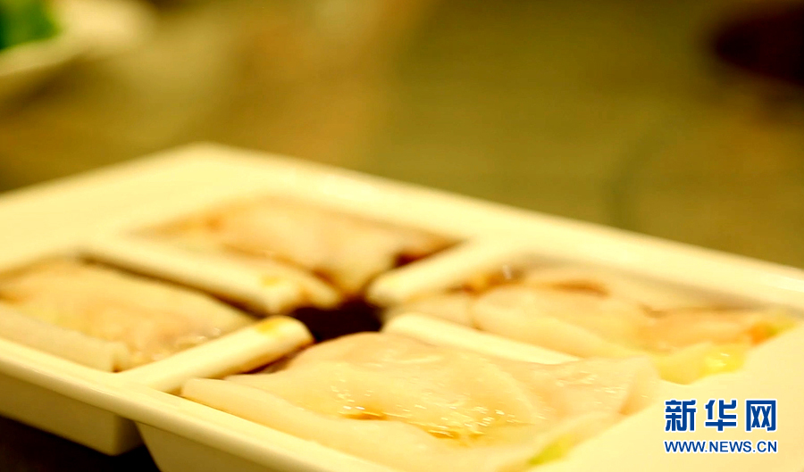 新鮮做成的沙河粉,晶瑩雪白,爽、韌、軟、滑,富有特色。新華網(wǎng)發(fā)